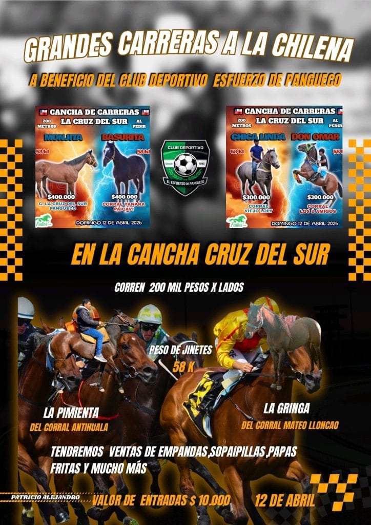 Es Para Este Domingo 12 de Abril en La Cancha Cruz De Sur Del Sector De Pangueco …Todos a Coperar…este Fin de Semana ….Valor de Entradas es $ 10.000 Se Nos Sumaron Más Carreras Para Este Domingo